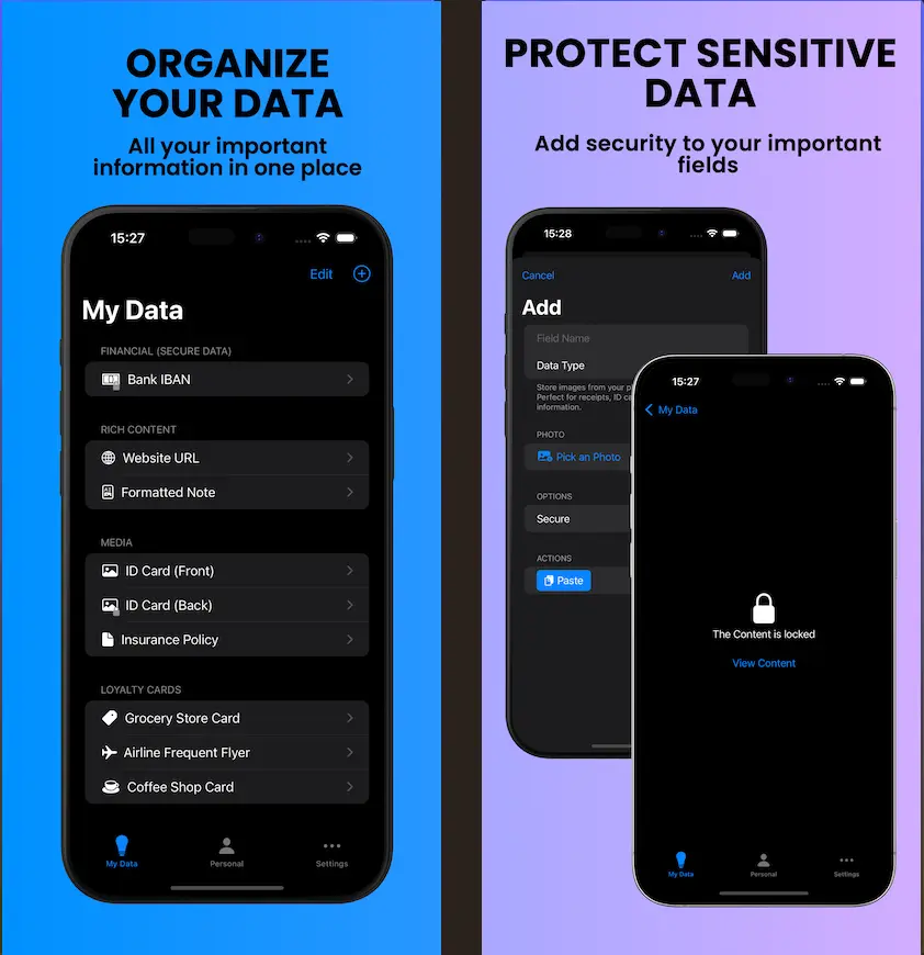 Easily organize bank accounts, loyalty cards, and documents in customizable tabs with fields for text, images, and PDF files. Protect sensitive data with selective authentication and quickly access information with instant copy. Data is stored locally only, never in the cloud or online, ensuring complete privacy even without an internet connection. No synchronization between devices for maximum security.